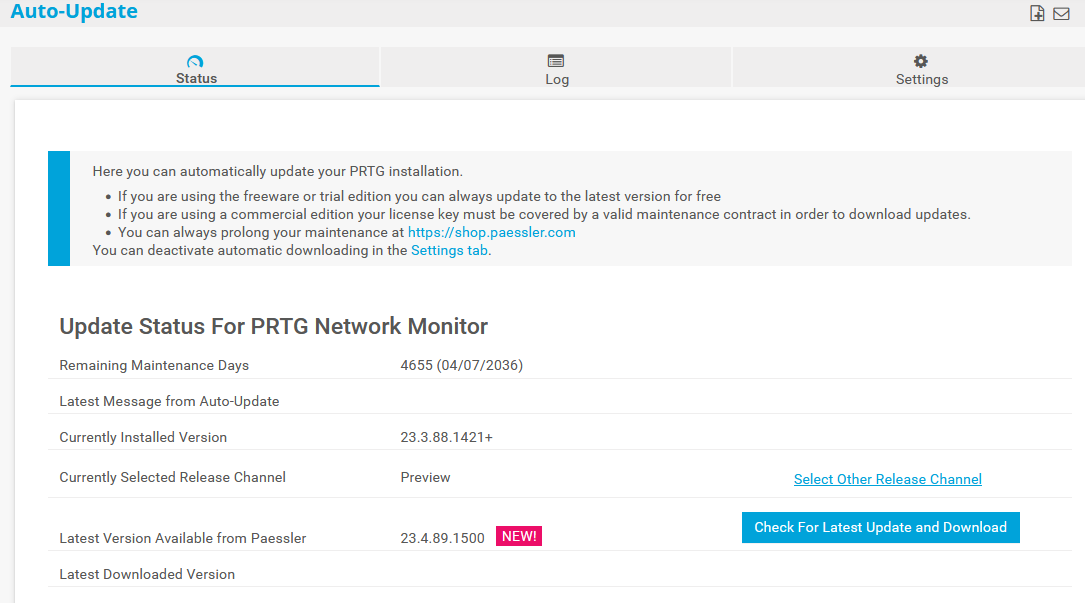 In this case, click Check For Latest Update and Download. PRTG connects to the Paessler servers and downloads the setup file, regardless of the status of the update check. Then click Install Update [version number].