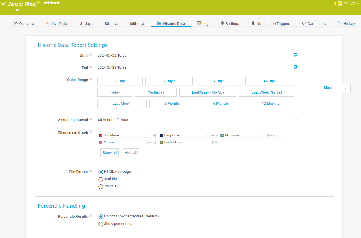 Show percentiles: PRTG displays an additional percentile calculation for the primary channel in the value table for each scanning interval.