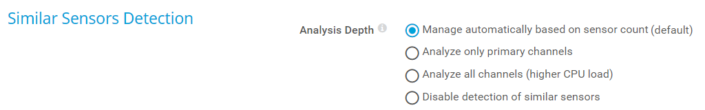 The Similar Sensors Detection feature enables PRTG to analyze sensor data for similarities. The detection runs in the background with low priority. The recommended setting for the analysis depth is to let PRTG automatically decide how many channels it analyzes. However, you can also override this setting.
