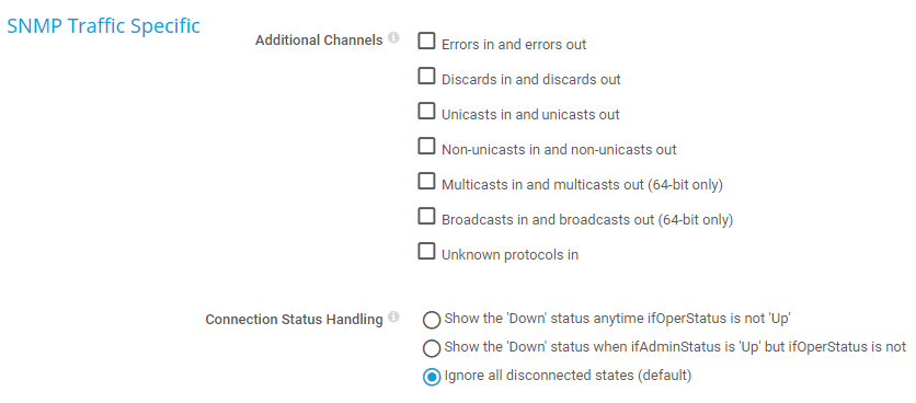Ignore all disconnected states (default): Show the Up status regardless of the ifOperStatus status. Monitoring might discontinue without notice.